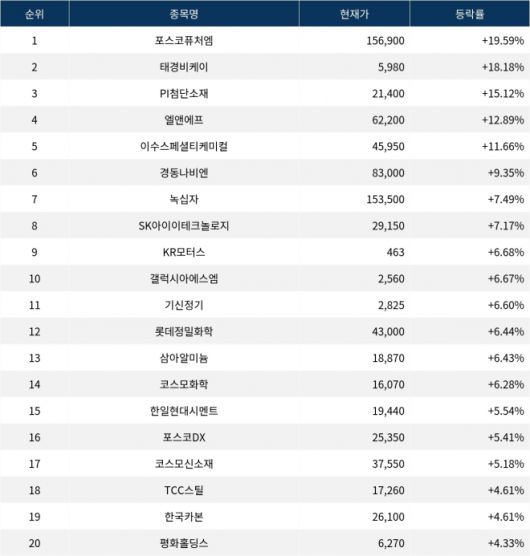 이어 상승률 2위 태경비케이(014580)는 주가가 18.18% 급등하며 종가 5,980원에 상승 마감했다. 상승률 3위 PI첨단소재(178920)의 주가는 21,400원으로 15.12% 급등하며 긍정적인 성과를 보였다. 상승률 4위 엘앤에프(066970)는 12.89% 상승하며 62,200원에 마감했다. 상승률 5위 이수스페셜티케미컬(457190)은 11.66%의 상승세를 타고 종가 45,950원에 마감했다.