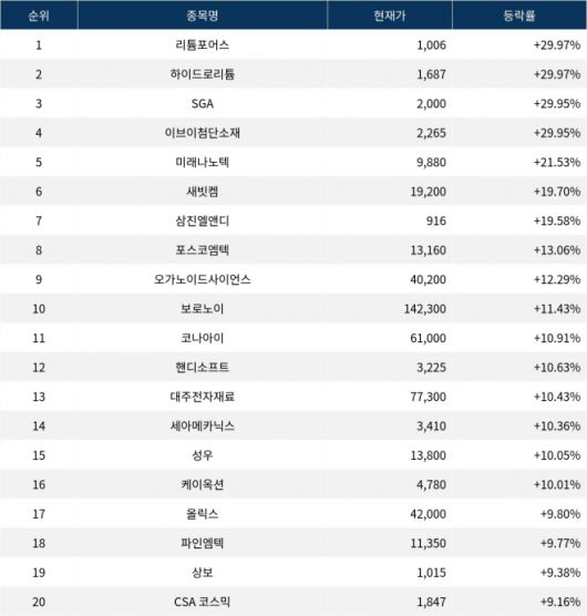 6위 새빗켐(107600)은 종가 19,200원으로 19.70% 급등 마감했다. 7위 삼진엘앤디(054090)는 종가 916원으로 19.58% 급등 마감했다. 8위 포스코엠텍(009520)은 종가 13,160원으로 13.06% 급등 마감했다. 9위 오가노이드사이언스(476040)는 종가 40,200원으로 12.29% 급등 마감했다. 10위 보로노이(310210)는 종가 142,300원으로 11.43% 급등 마감했다.