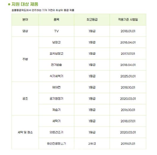 △효율등급제도에서 관리하는 11개 가전의 최상위 등급 제품이 해당됩니다. 아래 표를 참고해주세요. 최고등급과 함께 적용기준 시행일도 참조해야 합니다. 정확히 내 제품이 환급 가능한지를 확인하려면 안내센터 홈페이지 내 모델명 검색을 통해 쉽게 찾을 수 있습니다. 고객센터(평일 오전 9시~오후 6시 운영)로 전화해 문의해도 됩니다.