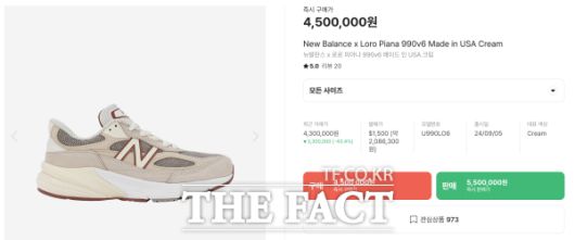 해당 상품은 이탈리안 하이엔드 브랜드인 '로로피아나'와 '뉴발란스'가 협업해 선보인 스니커즈로, 뉴발란스의 '클래식990' 모델을 현대적인 디자인으로 재해석한 제품이다. 정가는 1500달러(한화 약 200만원)이지만 전 세계에 1000켤레 한정 판매되면서 리셀가가 2배 이상으로 치솟았다.