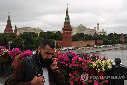 휴대전화 사용하는 모스크바의 한 남성 |