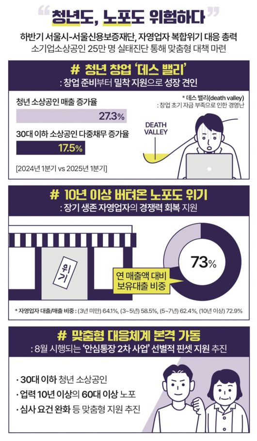 이에 서울시와 서울신보는 지난 17일 ‘2025년 하반기 소기업·소상공인 맞춤형 지원 정책’을 발표하고 서울신보 25개 전(全) 지점을 ‘종합지원센터’로 전환해 위기 단계별 대응 체계를 본격 가동했다. 지원은 ▲사업 초기 ‘밀착 창업 지원’ ▲장기 운영자 대상 ‘매출 구조 개선’ ▲경영 위기 시 ‘긴급 유동성 공급’ 등 기업 생애주기와 위기 유형에 맞춘 해법으로 구성됐다.