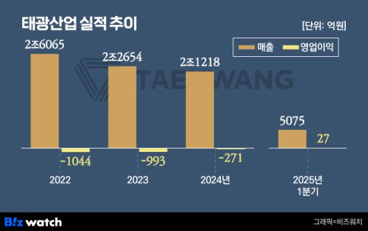최근 태광산업의 매출은 2022년 2조6065억원에서 2023년에는 2조2654억원으로, 2024년에는 2조1218억원으로 감소하는 추세다. 영업손실규모는 2022년 1044억원에서 2023년 993억원, 2024년 271억원으로 적자폭을 줄이고 있기는 하지만 이는 관계회사의 주식 처분 등의 영향이 반영된 것으로 업황이 개선됐기 때문이라고 보기는 어렵다.