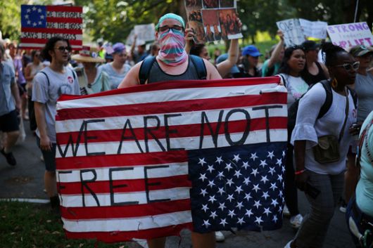 17일(현지시간) 미국 매사추세츠주 보스턴에서 열린 흑인 인권 운동의 대부, 고(故) 존 루이스 하원의원을 기리는 '굿 트러블 라이브스 온' 행진과 집회에서 한 시위대가 "우리는 자유롭지 않다"는 문구가 적힌 거꾸로 된 미국 국기를 들고 있다. 로이터=연합뉴스 |