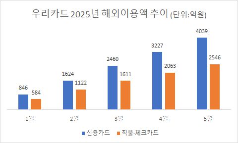 18일 카드업계에 따르면, 올해 5월 말 누적 기준 우리카드의 개인 신용·직불·체크카드의 해외이용금액은 6585억원으로 집계됐다. 이는 전년 동월 대비 147억원 줄어든 수준이다.