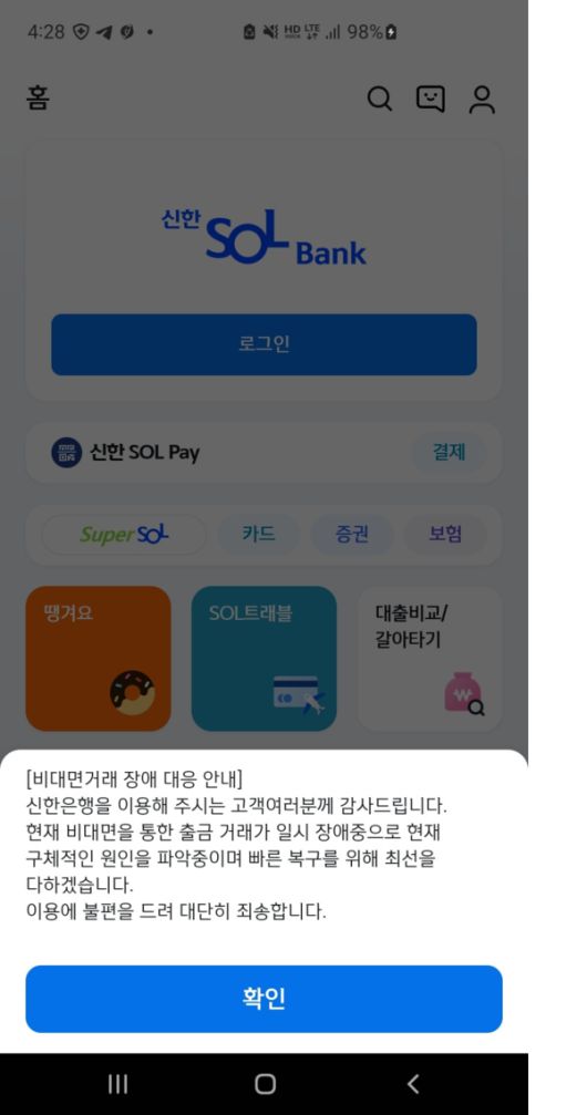 앱 내 이체 기능 등에 문제가 발생, 이용자들이 제대로 송금 등을 할 수 없었기 때문이다. 신한은행측은 즉시 쏠뱅크 앱에 '비대면거래 장애 대응 안내'를 띄우고 오류가 있음을 공지했다.