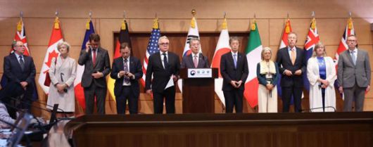 지난해 10월 서울 외교부 청사에서 열린 대북제재 관련 대외 발표에서 한국을 포함한 11개국 대표가 '다국적 제재 모니터링팀(MSMT)' 출범을 발표하고 있다. 한국일보 자료사진 |