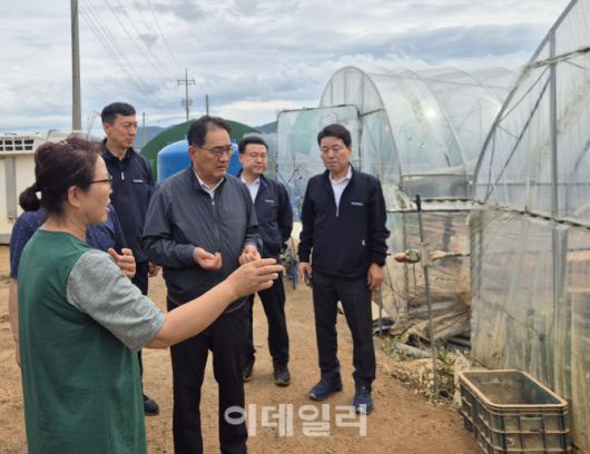 [이데일리 김태형 기자] 지준섭 농협중앙회 부회장이 18일 집중호우로 인하여 농작물과 농업시설에 큰 피해를 입은 충남 예산과 당진을 찾아 현장 상황을 살펴보고 있다.