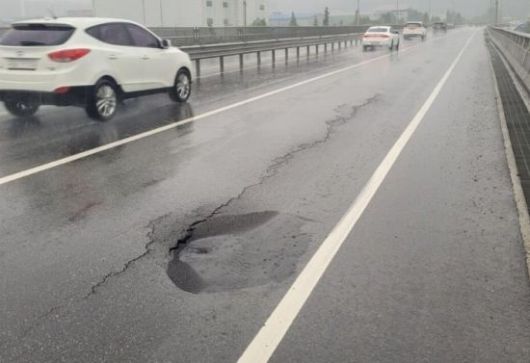 사고가 벌어진 경기 오산시 가장교차로 가고도로 2차선의 포트홀 모습. 온라인 커뮤니티 갈무리 |