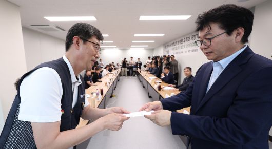이한주 국정기획위원장이 18일 정부서울청사 창성동 별관에서 노동정책 희생자 유족과 만나 김정욱 금속노조 쌍용자동차지부 법규실장으로부터 이재명 대통령에게 보내는 편지를 전달받고 있다. 연합뉴스 |
