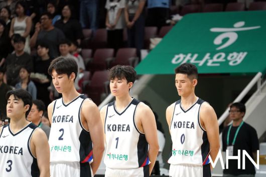 18일 경기 안양 정관장 아레나에서 '2025 남자농구 국가대표 평가전 3차전' 한국VS카타르 경기가 열렸다. 한국팀이 애국가에 맞춰 경례를 하고 있다. <저작권자 Copyright ⓒ MHN / 엠에이치앤 무단전재 및 재배포 금지>