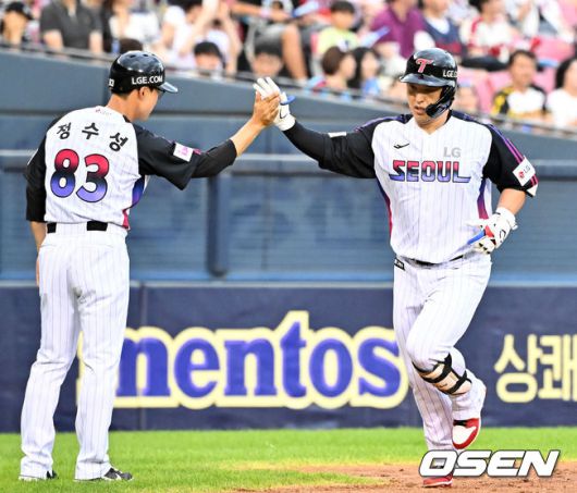 [OSEN=잠실, 민경훈 기자] 18일 오후 서울 잠실구장에서 ‘2025 신한 SOL BANK KBO리그’ LG 트윈스와 롯데 자이언츠의 경기가 열렸다. 이날 경기에서 LG는 손주영을, 롯데는 감보아를 선발투수로 내세웠다. 2회말 LG 선두타자로 나온 박동원이 좌월 동점 솔로 홈런을 때린 후 그라운드를 돌고 있다. 2025.07.18 / rumi@osen.co.kr