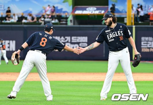 [OSEN=수원, 최규한 기자] 18일 수원 KT위즈파크에서 ‘2025 신한 SOL Bank KBO리그’ KT 위즈와 한화 이글스의 경기가 열렸다. 홈팀 KT는 오원석, 방문팀 한화는 코디 폰세를 선발로 내세웠다. 2회말 1사 주자없는 상황 KT 허경민의 내야 땅볼 타구를 처리한 한화 3루수 노시환과 선발 폰세가 인사를 나누고 있다. 2025.07.18 / dreamer@osen.co.kr