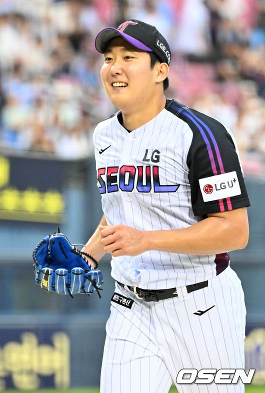 [OSEN=잠실, 민경훈 기자] 18일 오후 서울 잠실구장에서 ‘2025 신한 SOL BANK KBO리그’ LG 트윈스와 롯데 자이언츠의 경기가 열렸다. 이날 경기에서 LG는 손주영을, 롯데는 감보아를 선발투수로 내세웠다. 3회초를 마친 LG 선발 손주영이 미소 짓고 있다. 2025.07.18 / rumi@osen.co.kr