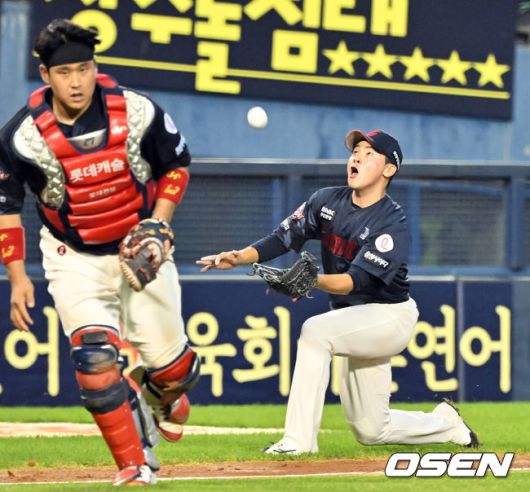 [OSEN=잠실, 민경훈 기자] 18일 오후 서울 잠실구장에서 ‘2025 신한 SOL BANK KBO리그’ LG 트윈스와 롯데 자이언츠의 경기가 열렸다. 이날 경기에서 LG는 손주영을, 롯데는 감보아를 선발투수로 내세웠다. 4회말 1사 LG 문성주의 파울플라이때 롯데 3루수 박찬형이 타구를 잡아내고 있다. 2025.07.18 / rumi@osen.co.kr