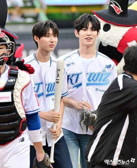 (엑스포츠뉴스 수원, 김한준 기자) 18일 오후 수원KT위즈파크에서 열린 '2025 신한 SOL Bank KBO리그' 한화 이글스와 KT 위즈의 경기, 경기 전 킥플립 주왕 민제가 시구 및 시타를 마친 후 그라운드를 빠져나가고 있다.김한준 기자 kowel@xportsnews.com