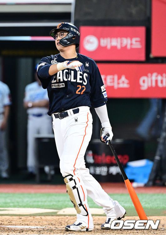 [OSEN=수원, 최규한 기자] 18일 수원 KT위즈파크에서 ‘2025 신한 SOL Bank KBO리그’ KT 위즈와 한화 이글스의 경기가 열렸다.홈팀 KT는 오원석, 방문팀 한화는 코디 폰세를 선발로 내세웠다.5회초 2사 1루 상황 한화 채은성이 달아나는 좌월 투런포를 날리고 있다. 2025.07.18 / dreamer@osen.co.kr |