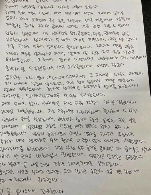 이어 "상대방이 제기한 강간, 강제추행, 불법 촬영 혐의 모두 사실이 아님이 확인됐다"라며 "모든 행위는 명백한 합의하에 이루어졌으며, 그 어떤 강제력도 존재하지 않았음이 객관적 증거를 통하여 밝혀진 것"이라고 덧붙였다.