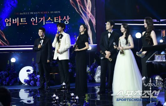 제4회 청룡시리즈어워즈(Blue Dragon Series Awards)가 18일 인천 파라다이스시티에서 열렸다. 업비트 인기스타상 수상한 박보검, 혜리, 이준혁, 아이유. 인천=송정헌 기자songs@sportschosun.com/2025.07.18/ |