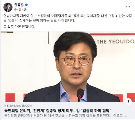 한 전 대표는 18일 페이스북에 “헌법가치를 지켜야 할 보수정당이 ‘계몽령자들’과 ‘강제 후보교체자들’ 대신 그걸 비판한 사람을 ‘입틀막’ 징계하는, 진짜 망하는 길로 가려 한다”며 “그 길로 가면 안 된다”고 밝혔다.