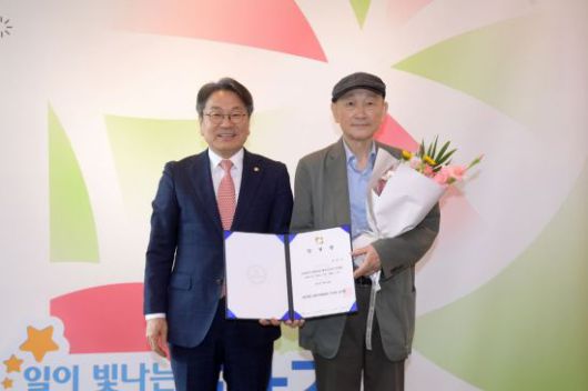 강기정 광주시장이 18일 오후 시청 접견실에서 윤범모 광주비엔날레 대표이사에게 임명장을 수여한 후 기념촬영을 하고 있다. 광주시 제공 |