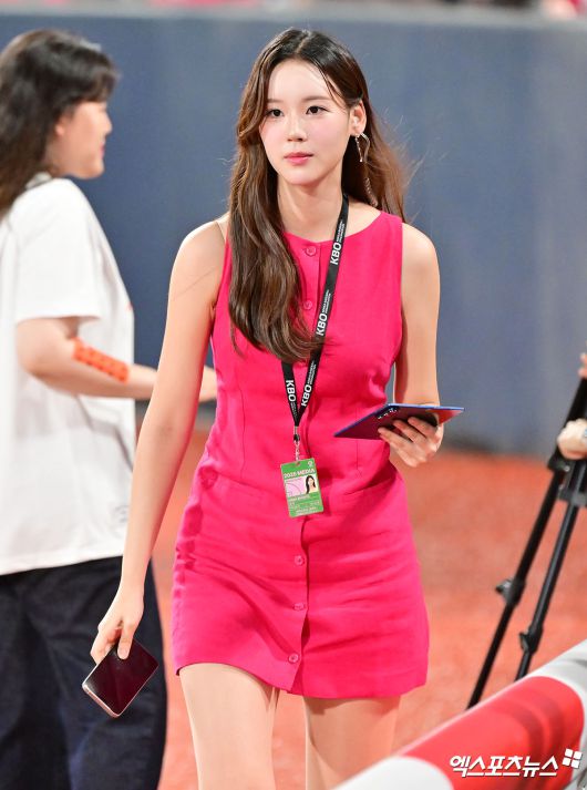 (엑스포츠뉴스 수원, 김한준 기자) 18일 오후 수원KT위즈파크에서 열린 '2025 신한 SOL Bank KBO리그' 한화 이글스와 KT 위즈의 경기, 한화가 선발 폰세의 호투와 채은성의 홈런포에 힘입어 KT에 5:0 승리를 거뒀다. KBSN 전세연 아나운서가 수훈 선수 인터뷰를 준비하고 있다.,김한준 기자 kowel@xportsnews.com
