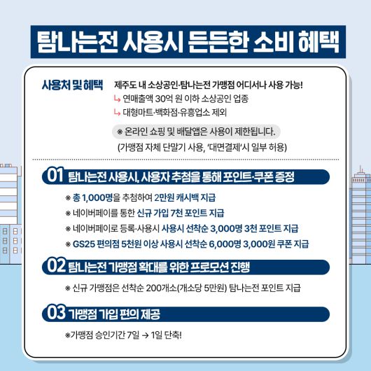 소비쿠폰은 신용·체크카드의 경우 연매출액 30억원 이하 소상공인 업종에서, 탐나는전의 경우 탐나는전 가맹점에서 사용할 수 있다. 온라인에선 사용할 수 없다. 농협 하나로마트는 소비쿠폰 사용 정책에 따라 대상에서 제외된다. 소비쿠폰 사용금액에 대해서는 탐나는전 인센티브 적립에서 제외된다.