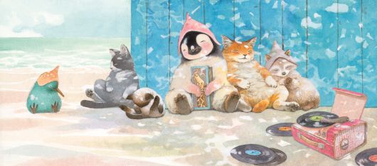 노트북을 펼친 고양이 곁에서 베개에 코를 박고 엎드린 펭귄과 토끼들이 게으름을 피우며 뒹군다. 펭귄이 뭔가 맘 상한 일이 있어 뚝뚝 눈물을 흘리면 고양이는 먼 델 보며 딴청 피우다 맛있는 우유병을 슬쩍 펭귄 쪽으로 밀어 놓는다. 붉은 실타래에 칭칭 함께 감긴 듯한 꼴이 돼도 ‘우리가 인연이라 그런가 보다’ 웃어 넘기고, 우스꽝스러운 새우 튀김옷을 입은 듯 창피를 당하더라도 가슴을 쭉 펼 수 있다. 그건 다 둘이 함께 있는 덕분이다.