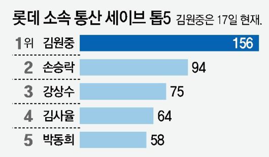 김원중은 5월 10일 수원 KT전에서 8-5 승리를 지켜내면서 롯데 구단 역사상 처음으로 6시즌 연속 두 자릿수 세이브를 올렸다. 프로야구 전체로 봐도 구대성(56), 진필중(53), 손승락(43), 정우람(40)에 이어 다섯 번째 기록이다. 김원중은 “대단한 선배님들과 이름을 견줄 수 있다는 것 자체가 영광이다. 또 마무리 보직이 그만큼 살아남기 힘든 자리라는 걸 또 한 번 느낀다”고 말했다.