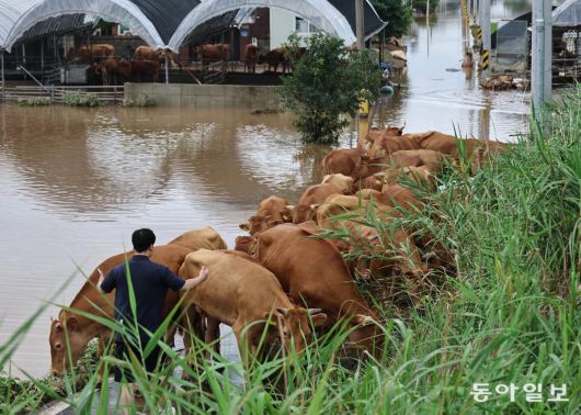 “소 살려” 우리 탈출한 소들 18일 오전 폭우로 충남 예산군 고덕면의 한 축산농가가 침수되면서 소들이 물에 잠긴 우리를 탈출해 뭍으로 나와 있다. 예산=양회성 기자 yohan@donga.com |
