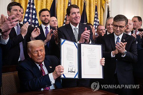 (워싱턴=연합뉴스) 김동현 특파원 = 도널드 트럼프 미국 대통령은 18일(현지시간) 가상화폐의 일종인 스테이블코인을 제도권으로 가져오는 데 필요한 규제 틀을 마련하는 '지니어스 법'(Genius Act)에 서명했다.
