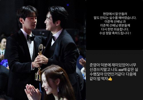 이준영은 이후 SNS에 사과의 글을 올리며 "현장에서 잘 안 들려서 말도 안 되는 실수를 해버렸습니다. 이준혁 선배님과 이준혁 선배님 팬분들께 다시 한번 죄송합니다. 수상 정말 축하드립니다!"라며 진심 어린 사과의 말을 전했다.