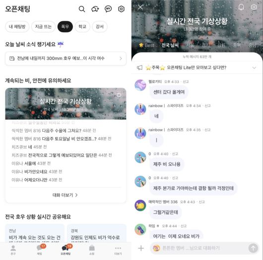 카카오톡 오픈채팅의 '폭우' 탭(왼쪽)과 폭우 탭에서 제공하는 실시간 전국 기상상황 오픈채팅 라이트 (카카오톡 캡처)