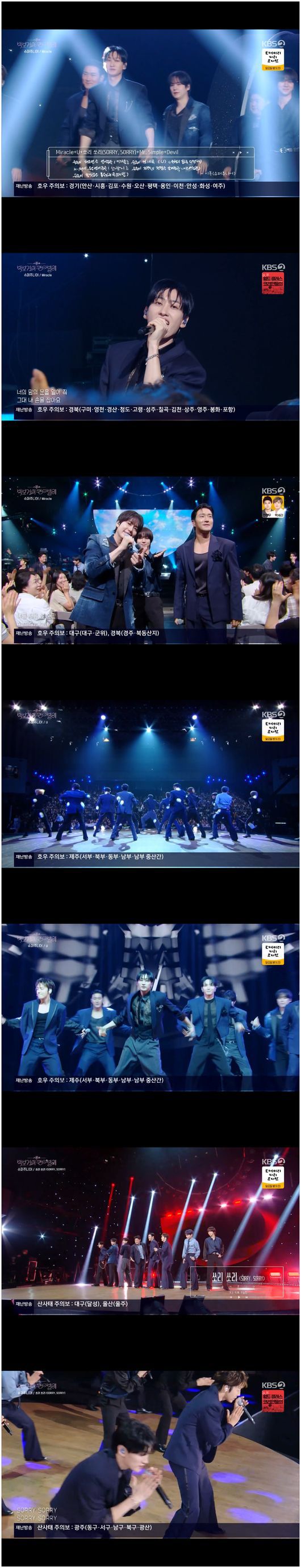 Miracle로 포문을 연 슈퍼주니어는 숏 재킷에 와이드 팬츠로 세미 정장을 입은 채 화려한 이너를 입어 '아이돌력'을 뽐냈다. 이특은 “20년의 역사를 기적으로 시작해 보겠다!”라면서 무대 시작 전 멘트를 쳐 환호를 받았다.