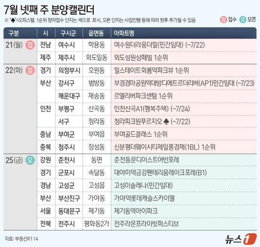 19일 부동산R114에 따르면 7월 넷째 주에는 전국 9개 단지 총 7956가구(일반분양 4951가구)가 분양을 시작한다. 경기 의정부 호원동 '힐스테이트회룡역파크뷰', 부산 해운대구 재송동 '르엘리버파크센텀' 등 9곳에서 청약을 진행한다.
