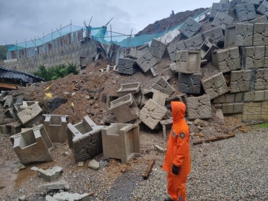 18일 경기 양주시 백석읍 기산리에서 산사태로 옹벽이 무너지며 주택을 덮쳤다. (경기북부소방재난본부 제공) |
