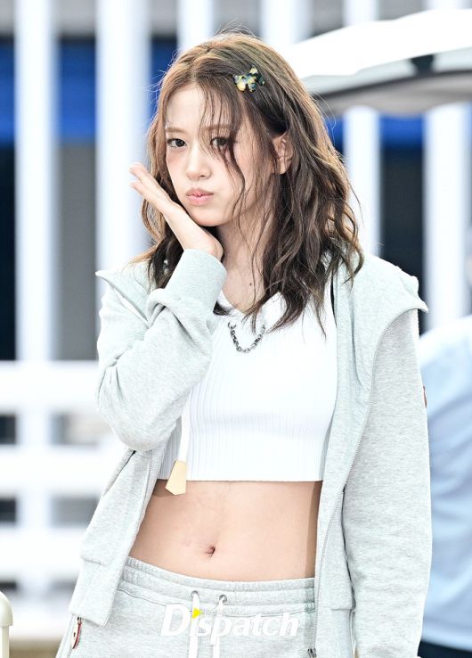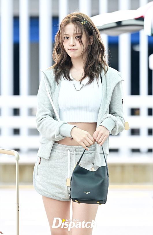 안유진은 파격적인 의상으로 눈길을 끌었다. 심플한 후드집업과 핫팬츠, 배꼽을 드러낸 탑 의상을 입고 출국장을 나섰다.