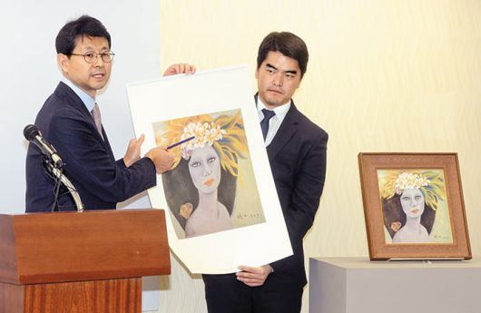 2016년 천경자의 ‘미인도’(오른쪽이 원본) 위작 논란을 수사한 검찰이 수사 결과를 발표하고 있다. ‘미인도’는 1991년 위작 논란이 불거졌는데, 검찰은 위작이 아니라고 밝혔다. /고운호 기자 |