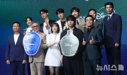 [서울=뉴시스] 김혜진 기자 = 배우 김민(윗줄 왼쪽부터), 이상진, 정윤호, 이동휘, 김성오, 강윤성 감독, 김의성, 임수정, 양세종, 류승룡이 8일 오전 서울 영등포구 콘래드 서울에서 열린 디즈니+의 오리지널 시리즈 '파인: 촌뜨기들' 제작발표회에서 포즈를 취하고 있다. 2025.07.08. jini@newsis.com |