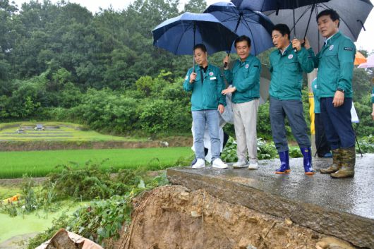 최학범 의장 등은 침수된 벼 농경지와 배수시설을 살피며 피해 상황을 확인했다. 이곳은 소하천 제방이 붕괴되고, 논 50ha와 수박·멜론 등 시설원예 33동이 침수된 피해가 발생했다.