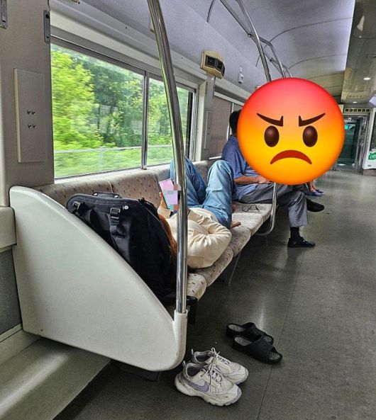 함께 공개한 사진에는 다른 승객들도 있는 열차 안에서 좌석 4칸을 차지하고 누워있는 승객의 모습이 담겼다. 그는 가방을 베개 삼아 머리를 대고 누워 휴대전화를 보고 있다. 신발은 가지런히 벗고 좌석에 맨발을 올려두기도 했다.
