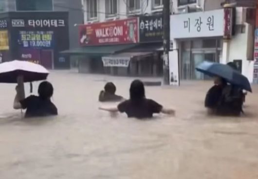 17일 광주광역시에 국지성 집중호우 피해가 잇따른 가운데, 시민들이 허리까지 찬 빗물을 헤치고 길을 건너고 있다.[X(구 트위터) 갈무리] |