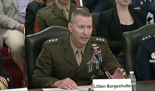 미국에서 해병대 장성으로는 처음 해군사관학교장 후보자로 지명된 마이클 보그슐테 중장. 사진은 지난 4월 연방의회 상원 군사위원회에 출석해 증언하는 모습. 방송 화면 캡처 |