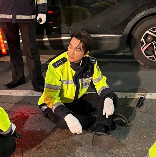 공개된 사진 속 송승헌은 형광색 경찰 제복을 입고 도로 위에 앉아 촬영 중인 모습이다. 흐트러짐 없는 헤어스타일과 진중한 눈빛, 날렵한 턱선까지 더해져 마치 실존하는 엘리트 경찰관을 연상케 했다. 특히 낮게 깔린 앵글에서 포착된 송승헌의 모습은 단순한 스틸컷을 넘어 하나의 드라마 속 명장면처럼 느껴질 정도로 강렬한 인상을 남겼다.