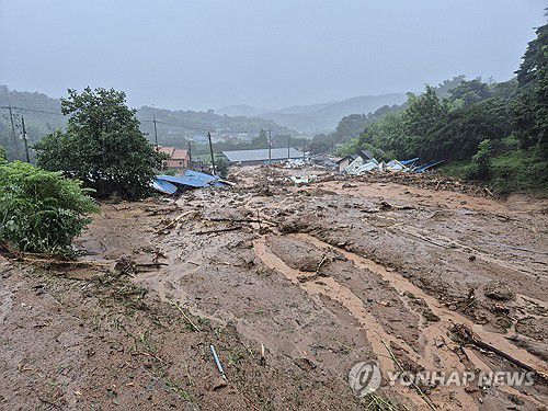 (산청=연합뉴스) 19일 오후 경남 산청군 산청읍 한 농장 인근이 집중호우로 인해 유출된 토사로 뒤덮였다. 2025.7.19 [경남소방본부 제공. 재판매 및 DB 금지]