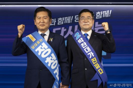 [서울=뉴시스] 김근수 기자 = 정청래(왼쪽) 더불어민주당 당대표 후보자와 박찬대 더불어민주당 당대표 후보자가 19일 서울 여의도 더불어민주당 중앙당사에서 열린 더불어민주당 당대표 및 최고위원 선출을 위한 충청권 합동연설회에 앞서 기념촬영을 하고 있다. 2025.07.19. ks@newsis.com /사진=김근수 |