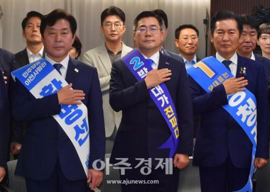 [사진=공동취재사진] 19일 오후 서울 여의도 더불어민주당 중앙당사에서 열린 '당대표 및 최고위원 선출을 위한 충청권 합동연설회'에서 정청래 당대표 후보(오른쪽부터)와 박찬대 당대표 후보, 황명선 최고위원 후보가 국민의례를 하고 있다.이날 대전에서 현장 순회 경선을 치르려 했으나 전국적으로 폭우 피해가 심하다는 점을 고려, 온라인 합동 연설회로 이를 대신하기로 결정했다. 2025.07.19 아주경제=유대길 기자 dbeorlf123@ajunews.com - Copyright ⓒ [아주경제 ajunews.com] 무단전재 배포금지 -