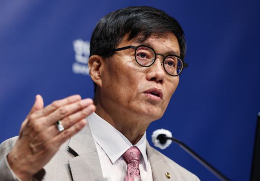 [서울=뉴스핌] 사진공동취재단 = 이창용 한국은행 총재가 10일 오전 서울 중구 한국은행에서 열린 통화정책방향 기자간담회에서 취재진 질문에 답하고 있다. 2025.07.10 photo@newspim.com