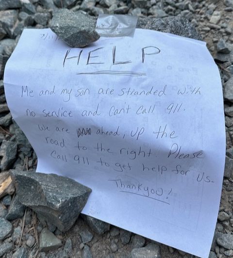 이 종이에는 “도와주세요. 나와 내 아들이 통신이 되지 않아 911에 전화할 수 없습니다. 우리는 오른쪽 도로 위쪽에 있어요. 911에 전화해서 도움을 요청해주세요. 감사합니다”라고 적혀 있었다.