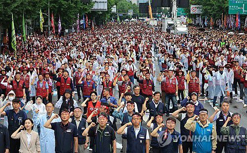 (서울=연합뉴스) 최원정 기자 = 전국민주노동조합총연맹(민주노총)은 19일 오후 서울 중구 을지로입구역 인근에서 총파업대회를 열고 '노란봉투법'(노동조합법 2·3조 개정안) 즉각 처리 등을 촉구했다.